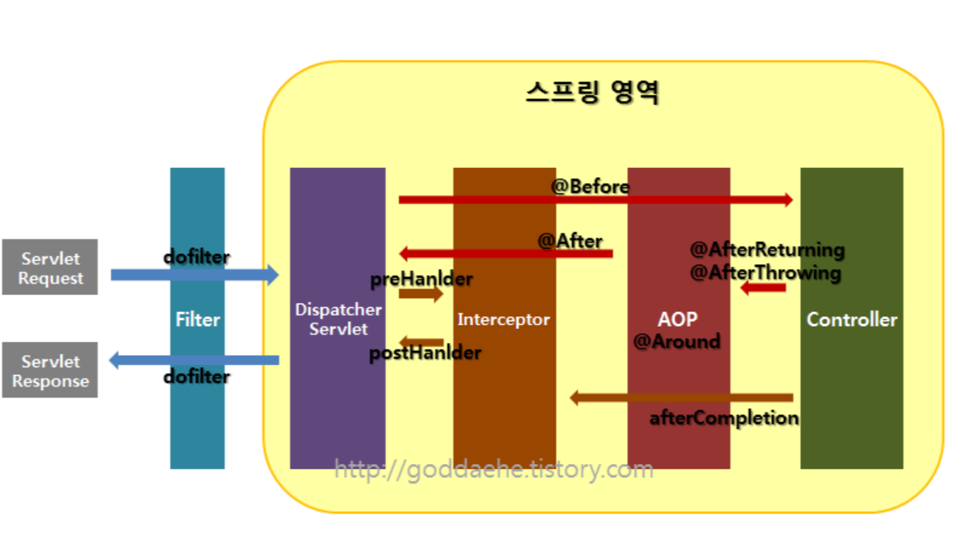 실행 순서: Filter → Interceptor → AOP → Interceptor → Filter
