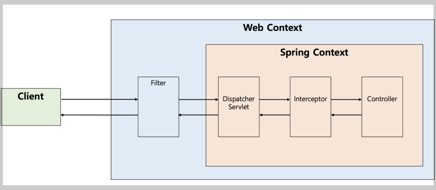 - Interceptor는 Dispatcher Servlet 안에 위치함. - Spring context에 존재, 모든 Spring Bean에 접근 가능 |