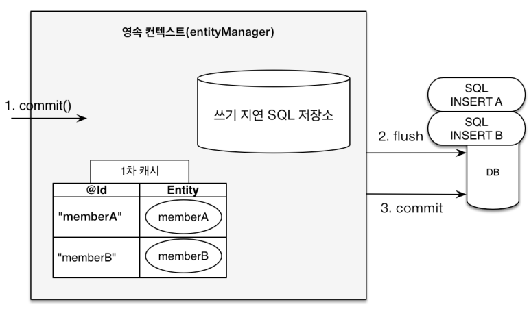 쓰기 지연 SQL저장소 속 SQL이 실제 DB에 flush되고 commit됨.