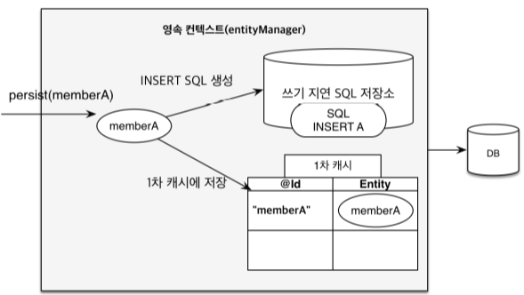 1차 캐시에 저장 및 쓰기 지연 SQL 저장소에 SQL 쌓음.