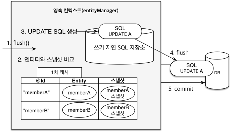 - 트랜잭션이라는 작업 단위가 중요 -> 커밋 직전에만 동기화(flush) 하면 됨 (commit 하면 자동으로 flush 먼저 실행)