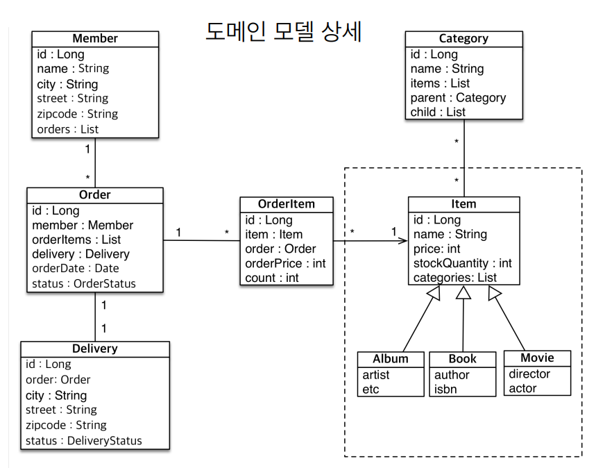 album, book, movie는 같은 Item묶음이니까 entity를 써주고 날짜를 쓸 때 delivery, order, item은 같은 묶음이 아니니까 @MappedSuperClass로 속성만 내려 사용