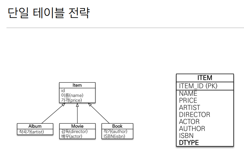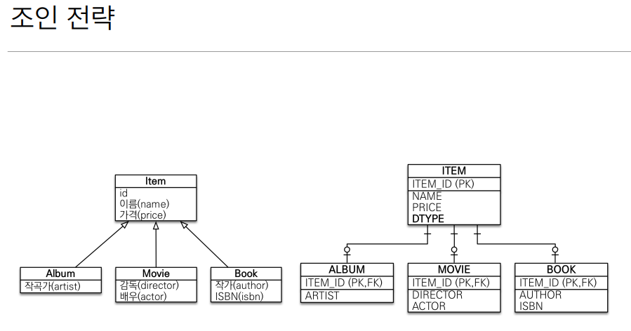 기본적으로 단일테이블전략으로 생성되는데 Item에 @Inheritance(전략 어쩌고 join)을 해주면 조인전략으로 테이블 생성됨.