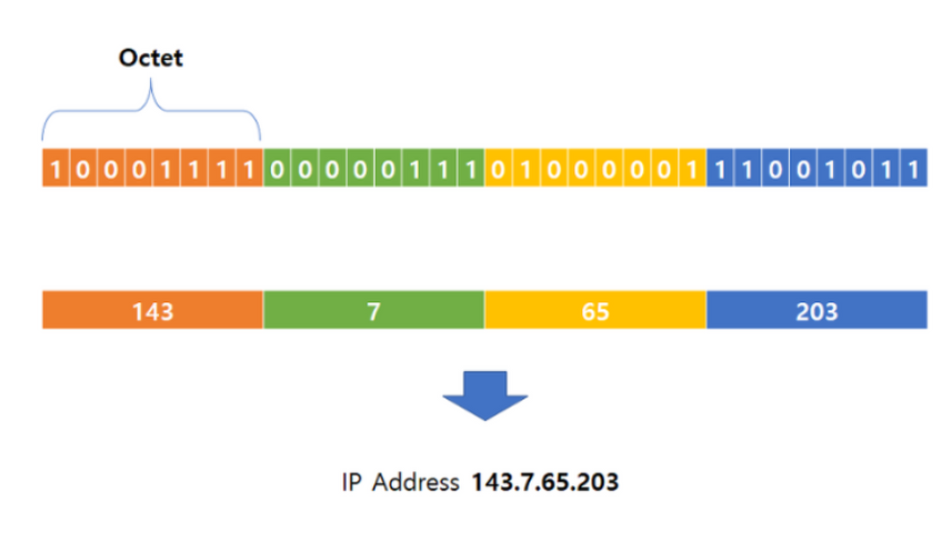 아래 그림과 같이 하나의 옥텟은 8비트로 이루어져 있으며 일반적으로 사용하는 IPv4 주소는 4개의 옥텟으로 이루어져 있다.